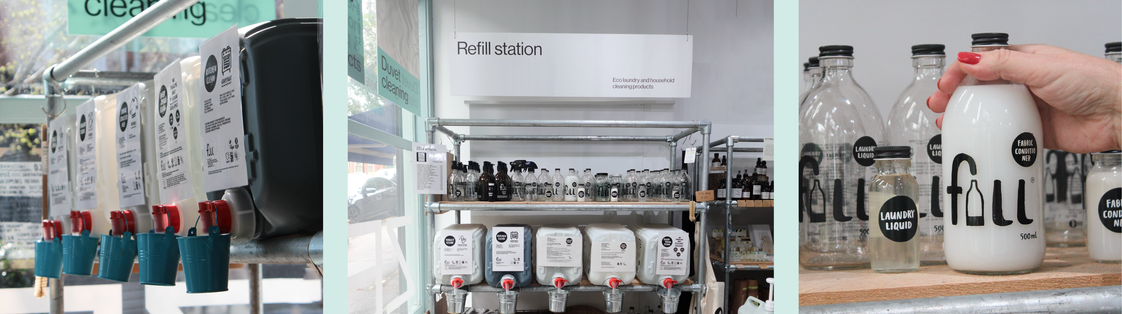 In store, our refillable station contains products designed for a cleaner home and a greener planet.