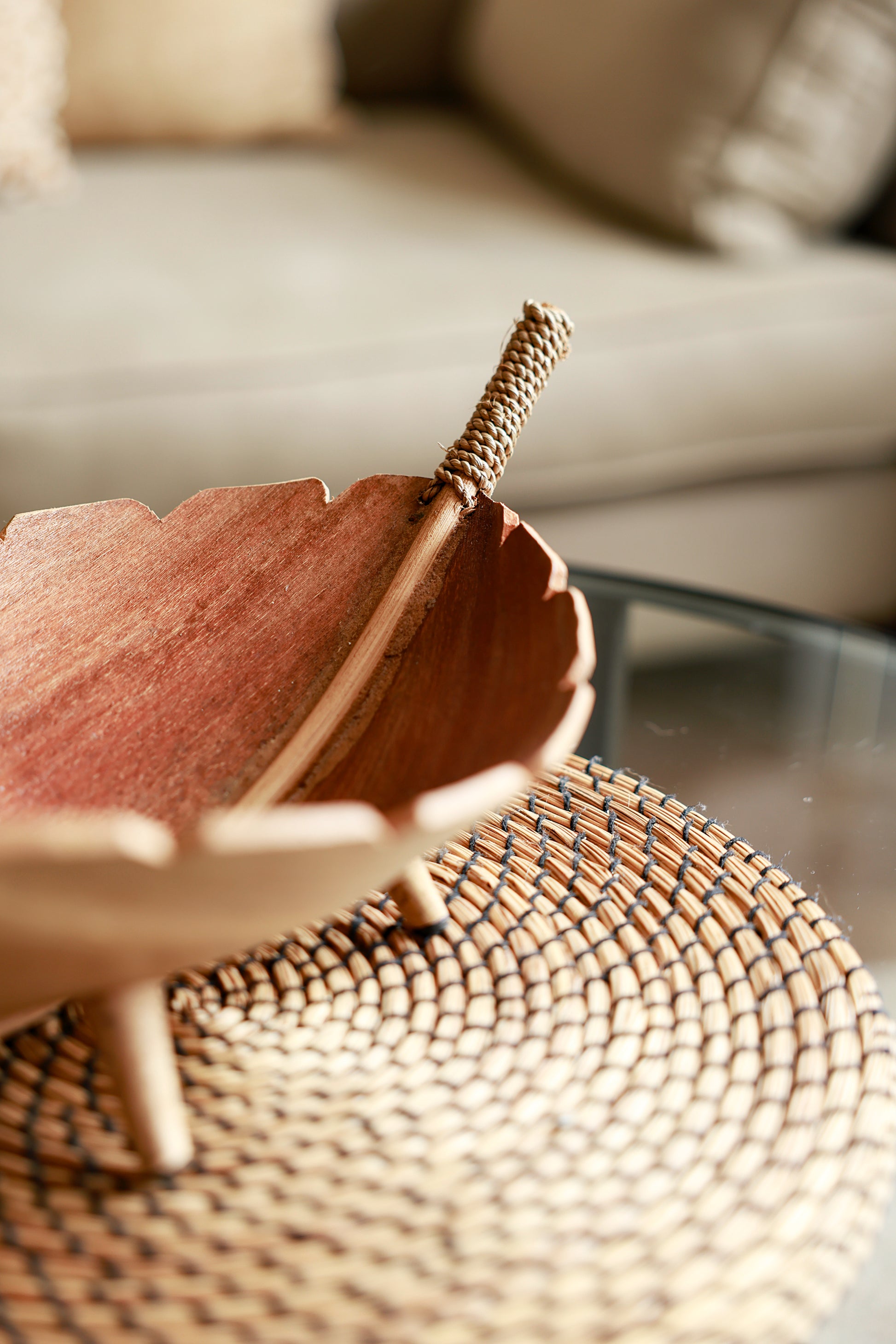This bowl is carved from sustainably sourced coconut leaves, preserving the natural wood grain and texture for an earthy, authentic look. This large, deep bowl is ideal for displaying fruit, serving bread, or as a decorative item in any home.